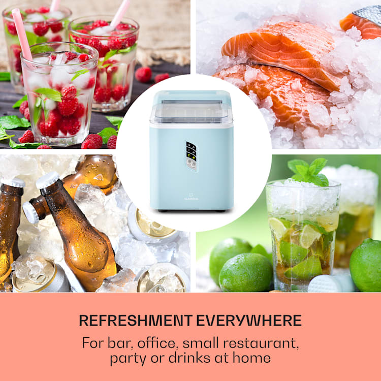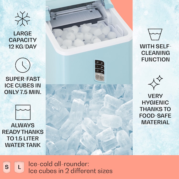 The Klarstein Albaron ice cube machine is the ideal partner for any party or hot summer day where chilled drinks are a must. Whether you're having a small get-together or hosting a large party, this machine will ensure that your guests can always enjoy perfectly chilled drinks. Within 24 hours, the Albaron produces up to 12 kg of ball-shaped ice cubes, in two sizes of your choice: large or small. Simply fill the 1.5-liter water reservoir, turn on the machine, and within just 9 minutes you'll have your first load of ice ready. For smaller ice cubes, it takes even just 7.5 minutes. With a handy 600 g catch basin, you'll have enough ice on hand without having to keep refilling. Thanks to the indicator lights on the clear display, you know exactly when it's time to refill water or empty the tray, making it extra easy to use. After the party, you can clean the machine quickly and hygienically thanks to the self-cleaning program. Moreover, the inside of the Klarstein Albaron is completely BPA-free, so you can be assured of safe, clean ice cubes. In short, this ice cube maker offers convenience, speed and reliability for all your party and daily needs.Specifications