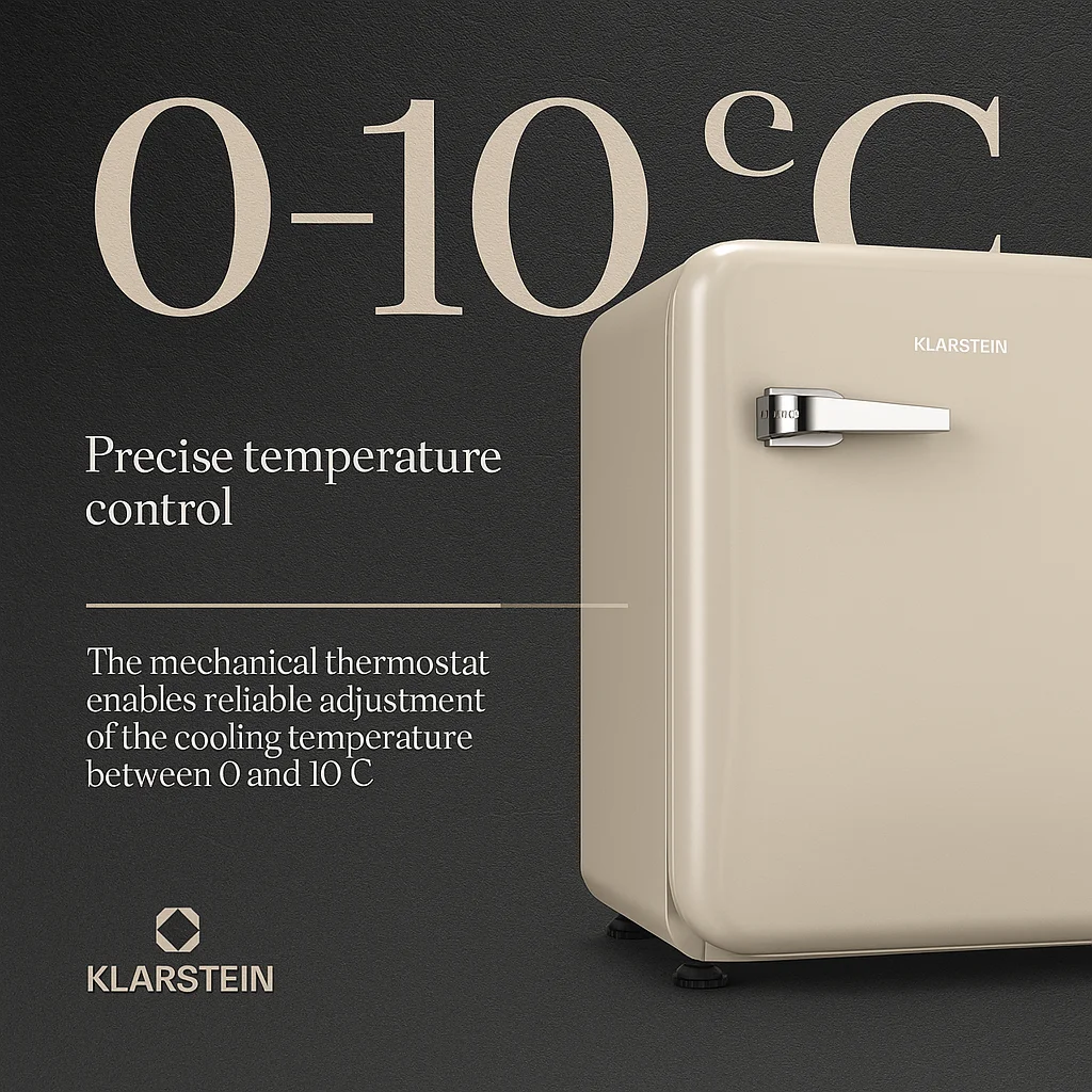 The vintage design with rounded corners and glossy finish brings a touch of nostalgic elegance to any room. Inside, the powerful compressor cooling system ensures reliable performance and precise temperature control from 0 to 10 °C via the mechanical thermostat.