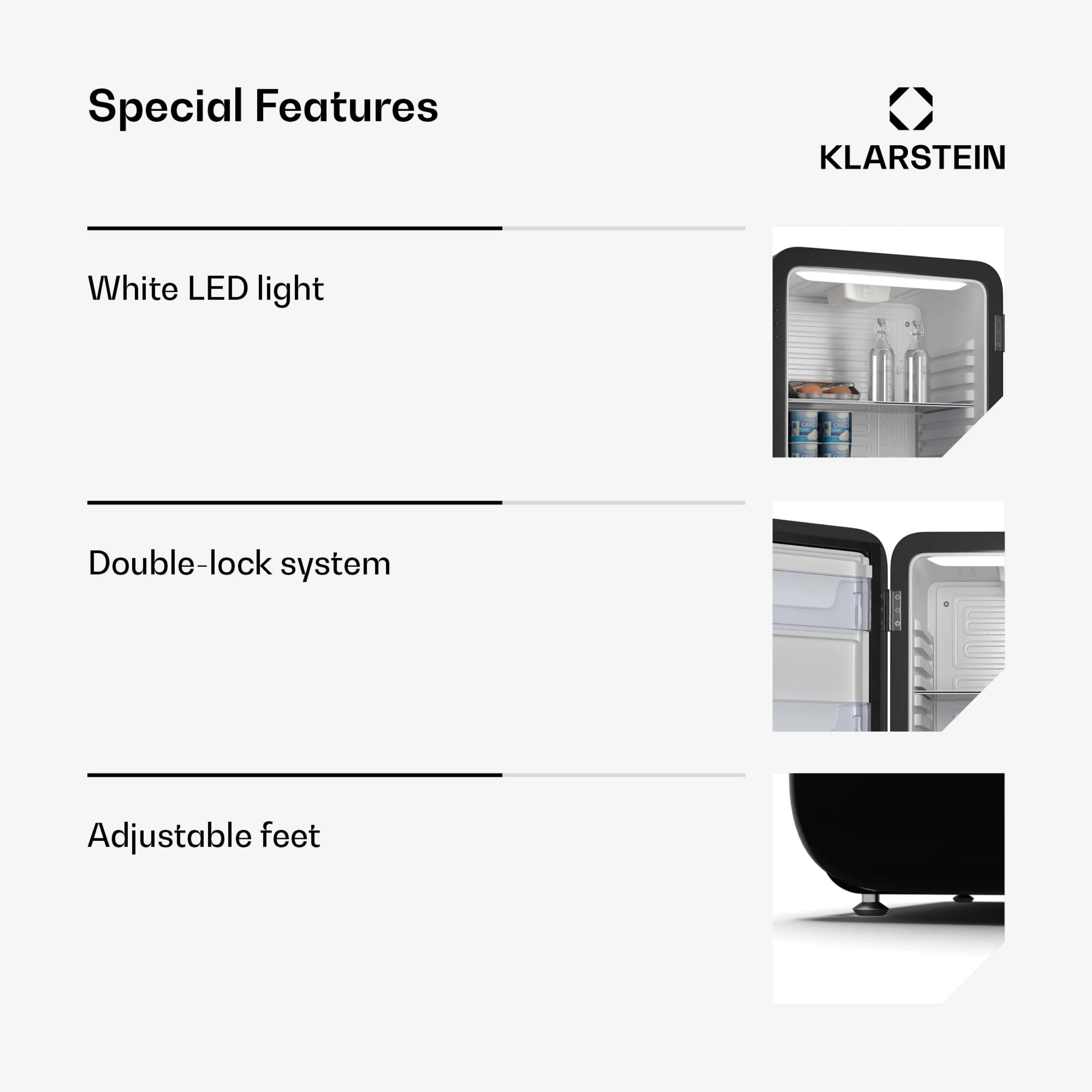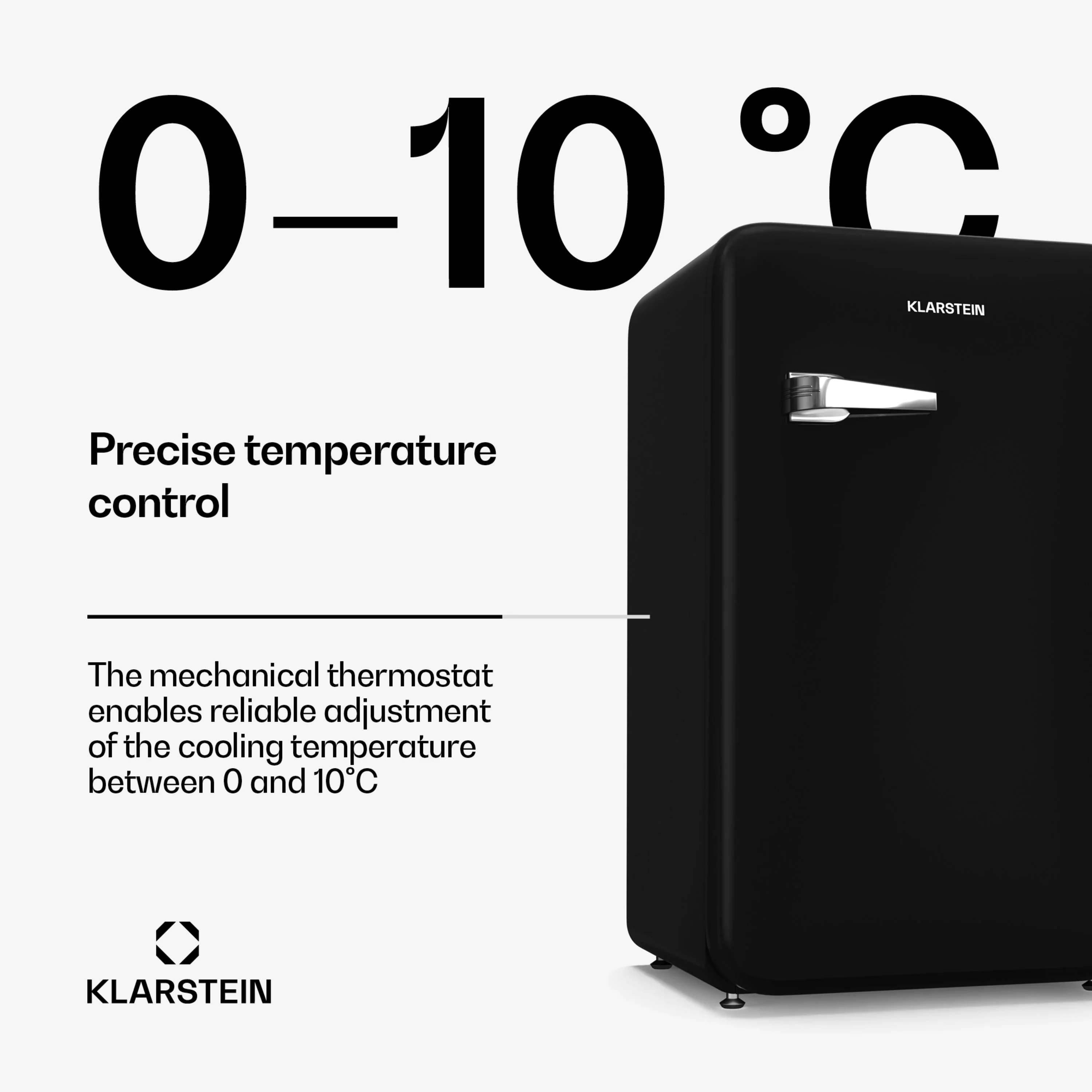 The retro design adds a touch of charm to any room, while the powerful compressor cooling system delivers reliable performance. The mechanical thermostat allows for precise temperature control between 0 and 10°C.