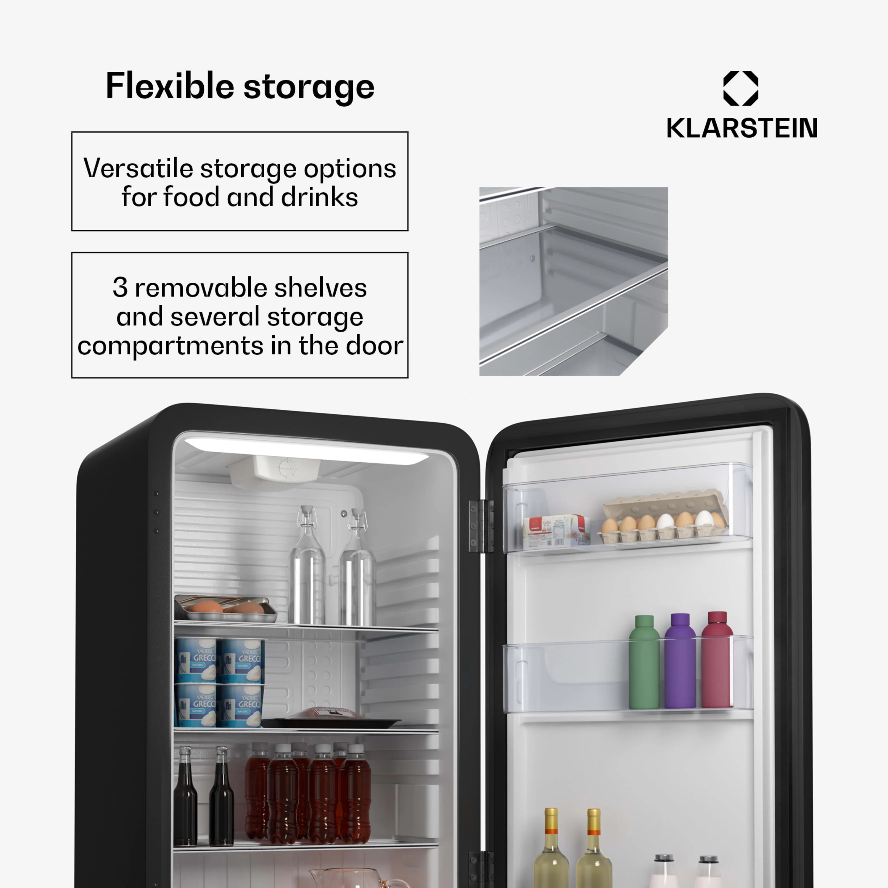 Despite its compact size, the Audrey Evo offers a surprising amount of storage space. The removable shelf and door compartment allow for organized storage of drinks, snacks, and other treats.