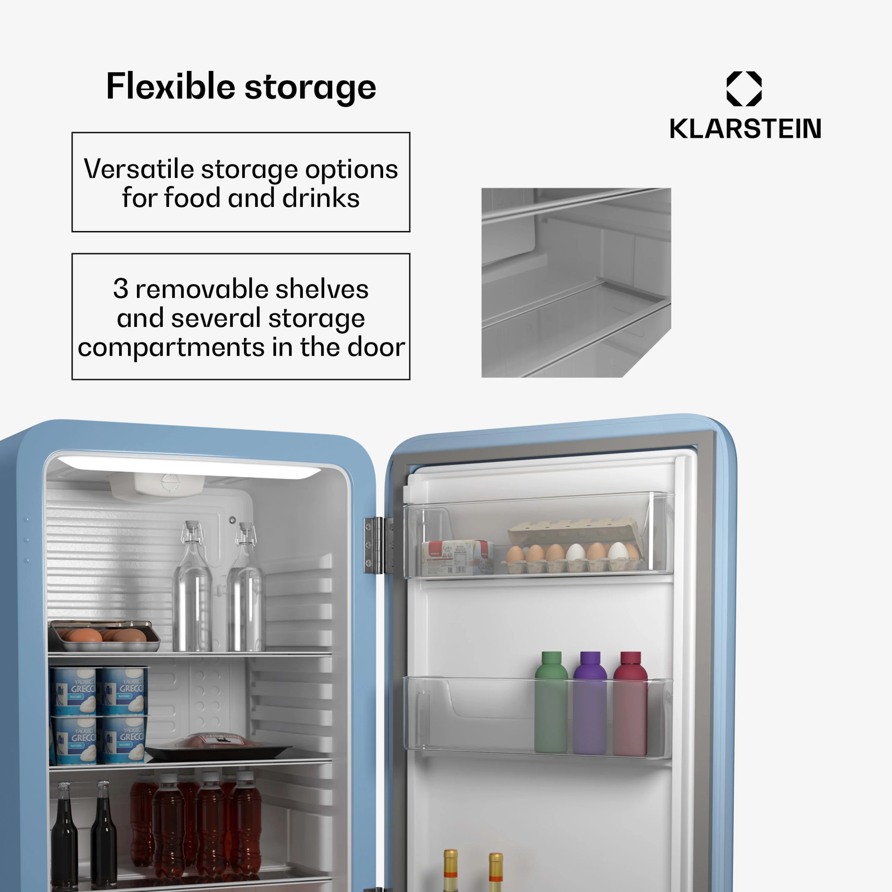 Despite its compact size, the Audrey Evo offers a surprising amount of storage space. The removable shelf and door compartment allow for organized storage of drinks, snacks, and other treats.