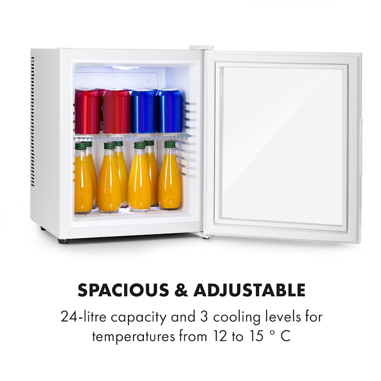 Compact yet very large in terms of storage space: the Klarstein Brooklyn 24 mini refrigerator offers plenty of space with 24 liters of usable capacity. Ten inserts, each with 2 cm spacing, offer various possibilities to flexibly arrange the interior using the plastic tray. For cooling as desired, 3 levels are available to regulate the cooling capacity from 12 to 15 °C. An asset for every small household: the Klarstein Brooklyn 24 mini-fridge.Specifications