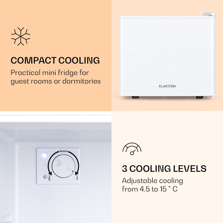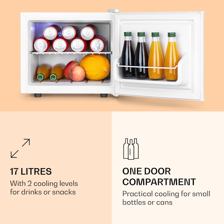 Enjoy cool refreshment right in your room with the Klarstein Geheimversteck mini-refrigerator. This compact 17-liter mini-fridge is perfect for anyone who loves cool drinks and snacks at their fingertips. With two levels in the cooling compartment, it provides ample storage for all your favorite refreshments, ideal for use in the dorm, guest room, or garden shed. Thanks to its quiet operating noise of only 26 dB, this mini-fridge does not disturb, making it suitable for dorm rooms or hotel rooms as well. Choose the Klarstein Geheimversteck for efficient, silent cooling in a stylish and compact design.Specifications