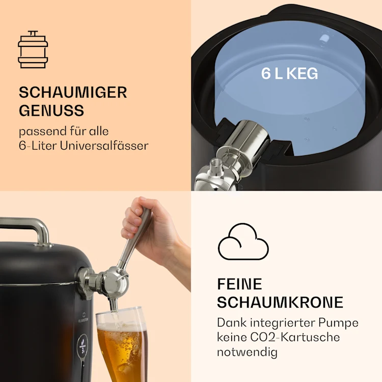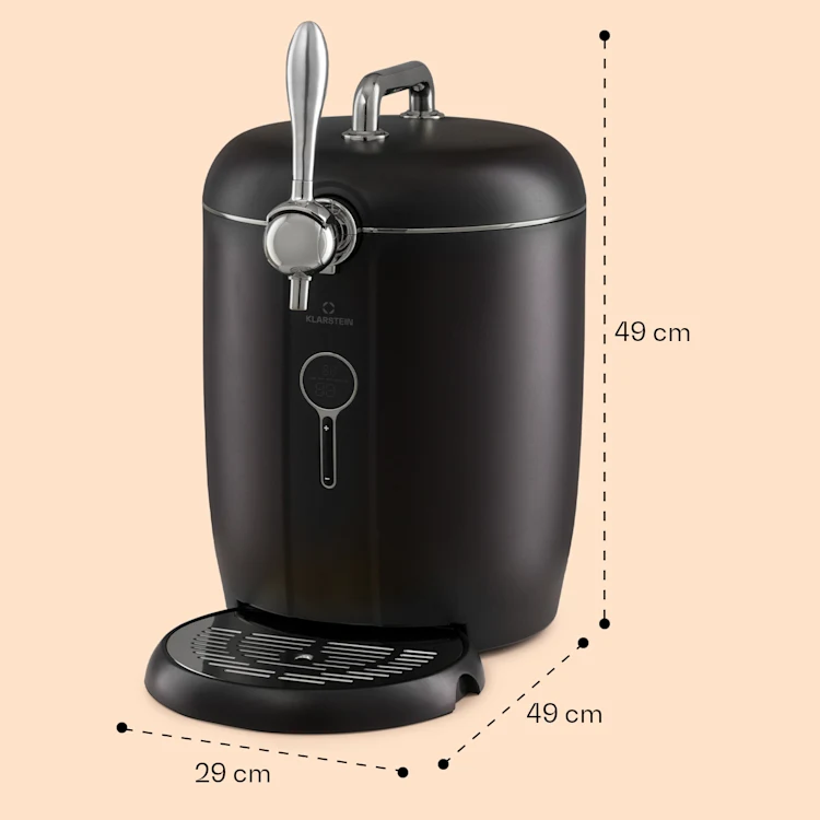 The Klarstein Passau Beer Taping System allows you to enjoy extra-cool, extra-fast beer at your home bar : because it tastes best when it's freshly tapped! The Klarstein Passau Beer Taping System ensures constant hop enjoyment from all sealed 6-liter kegs. Thanks to the integrated compressed air pump, you don't need an additional CO2 cartridge and can still enjoy any beer with a particularly frothy crown. You can choose the cooling temperature from 3 to 12 °C and view it at any time thanks to the LED display. Thanks to the constant fill level display on the beer cooler, you also have the best overview of your beer stock. Dosing is super easy and thanks to the removable drip tray, every countertop stays clean. The small, compact size makes the beer tap easy to use anywhere. On the Olympus of beer enjoyment, ice cold refreshment straight from the keg: the Klarstein Passau beer tap system .Specifications