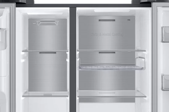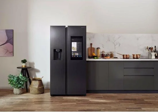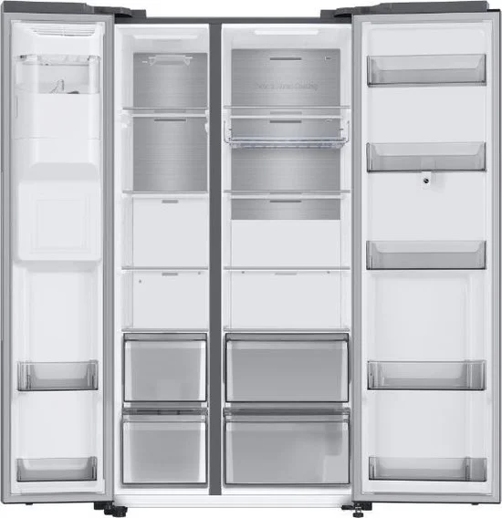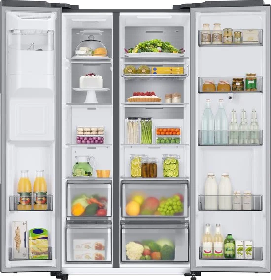 The Samsung RS6HA8891SL American refrigerator not only offers generous space with a capacity of 634 liters, but also brings smart technology to your kitchen thanks to the integrated Family Hub. This innovative display on the fridge door allows you to play music, search for recipes, keep track of your shopping list and even view the contents of your fridge without opening the door. Twin Cooling Plus™ technology keeps your food fresh for longer by providing the perfect humidity in the refrigerator and freezer compartments. With the No Frost function, you'll never have to manually defrost again. In addition, the energy-saving Digital Inverter Compressor ensures efficient performance. The sleek, stainless steel design and water and ice dispenser make this refrigerator a stylish and practical choice for the modern kitchen.Specifications