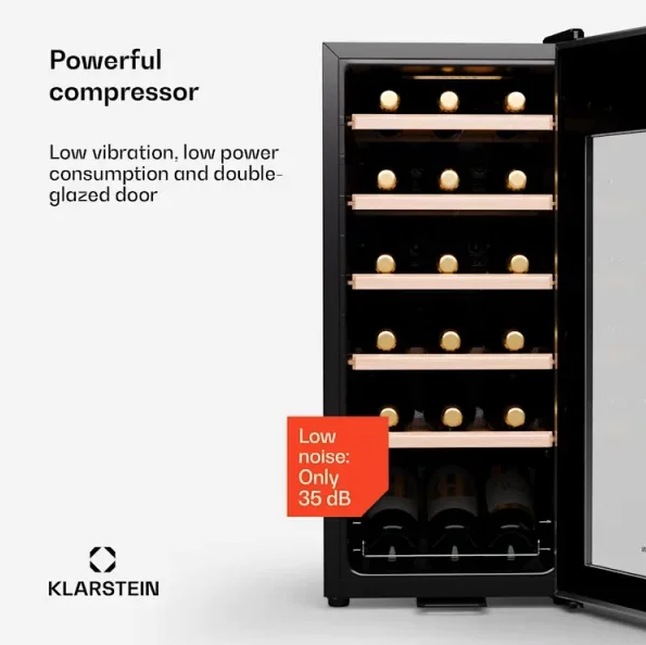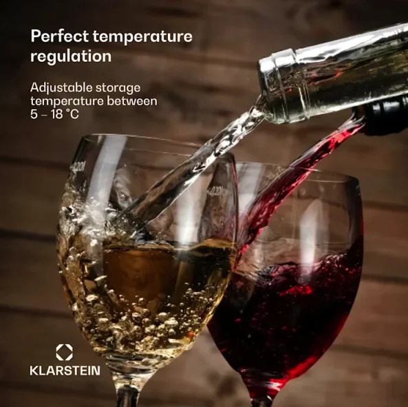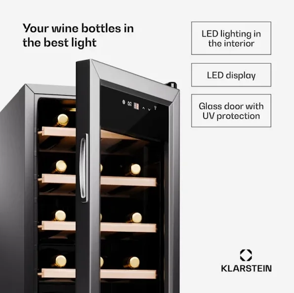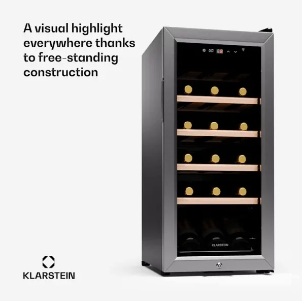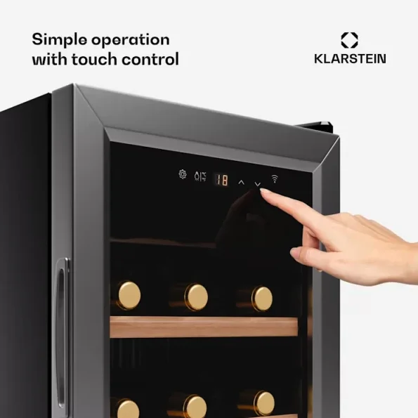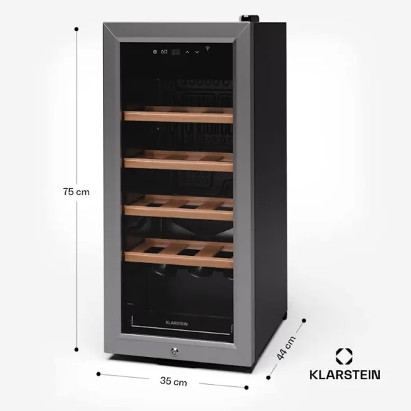 The Shiraz Premium Smart 18 Slim wine refrigerator offers a perfect combination of modern technology and elegant design. With an 18-bottle capacity and adjustable temperature settings, this refrigerator keeps your wines at the ideal temperature. The smart app control makes it easy to control your refrigeration wherever you are. The sleek design with a glass door gives a luxurious look and showcases your wine collection beautifully. Thanks to its quiet operation, the Shiraz Premium Smart 18 Slim is perfect for any interior, from the kitchen to the living room. Enjoy your wines in style with this sophisticated wine refrigerator.Specifications