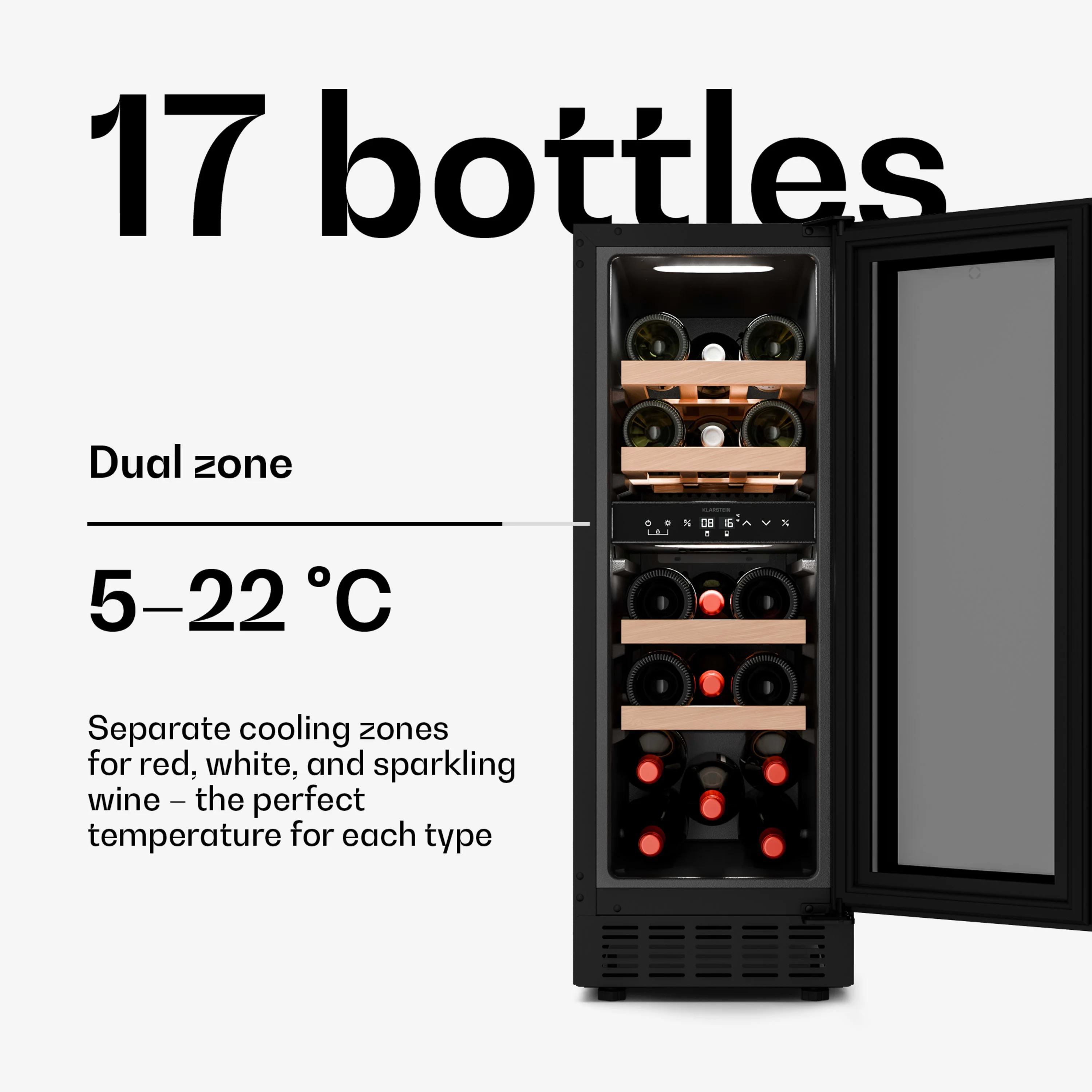 With a dual cooling zone, the Velaire wine climate cabinet offers the perfect conditions for white wine, red wine, and champagne. The temperature can be set between 5 and 22 °C via an intuitive touch control panel, so that every bottle remains at the ideal serving temperature.