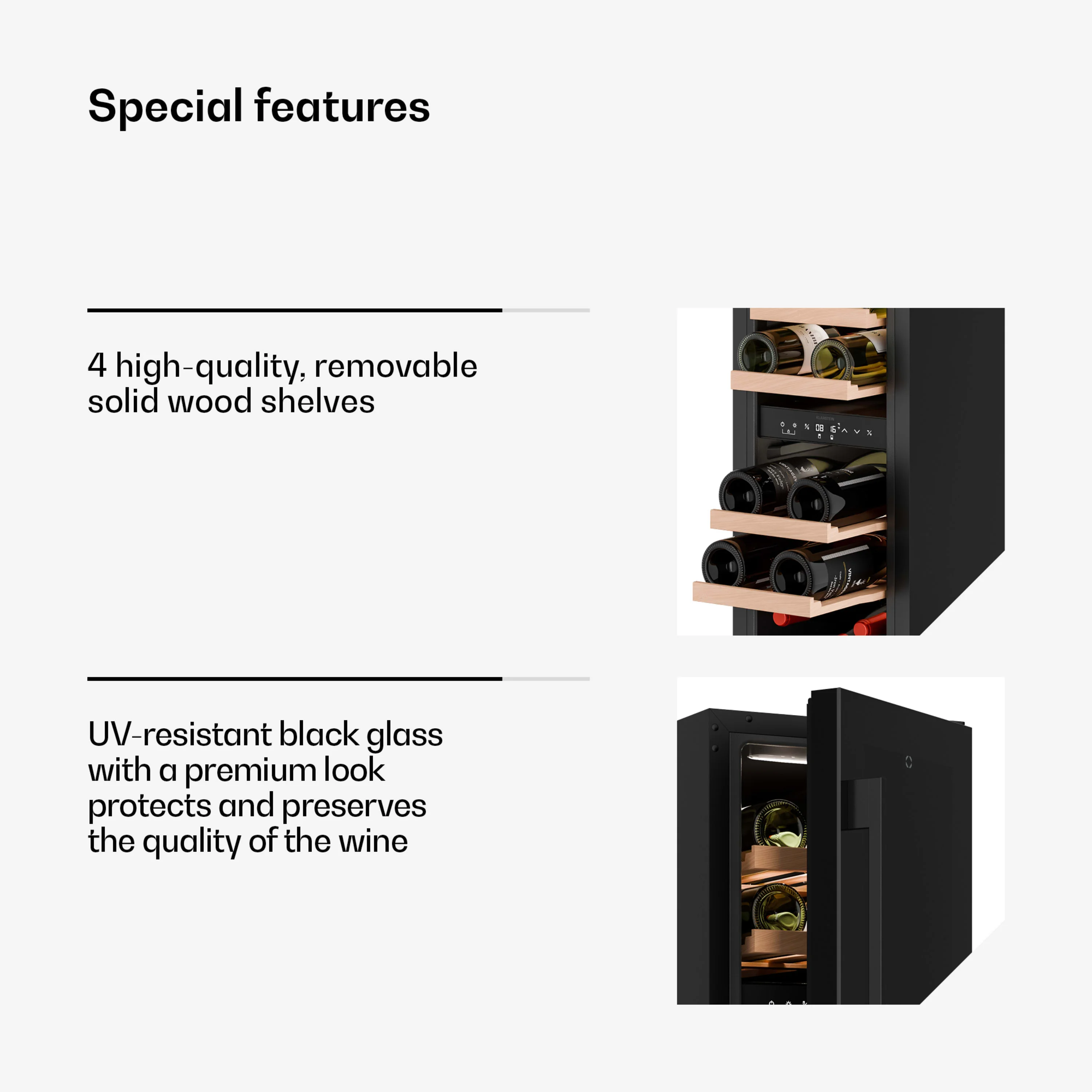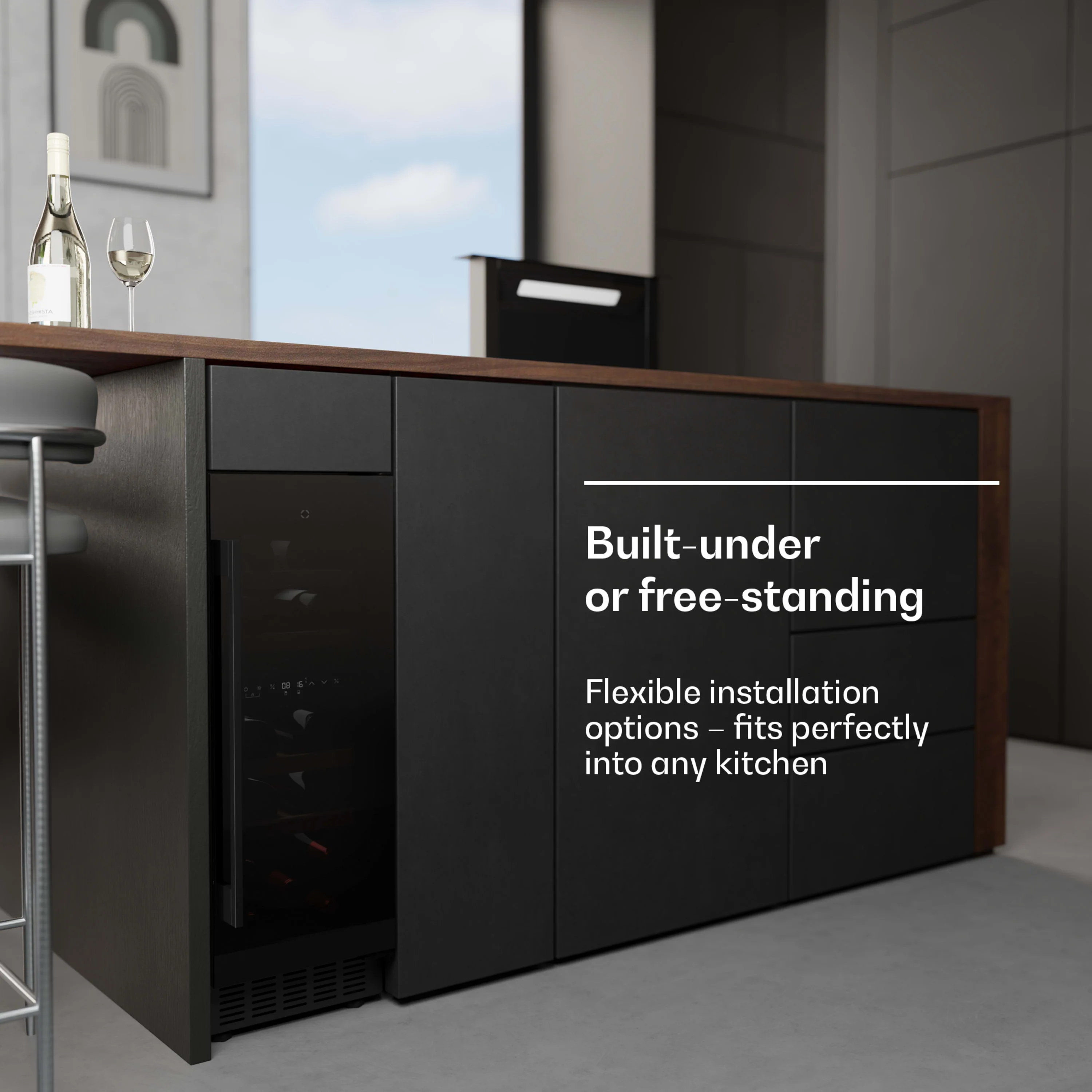 The wine refrigerator has four high-quality, removable wooden shelves, with space for up to 17 bottles of wine, stylishly illuminated with internal LED lighting. Thanks to its flexible design, the Velaire is suitable as a freestanding wine refrigerator or as a built-in wine refrigerator, depending on your kitchen requirements.