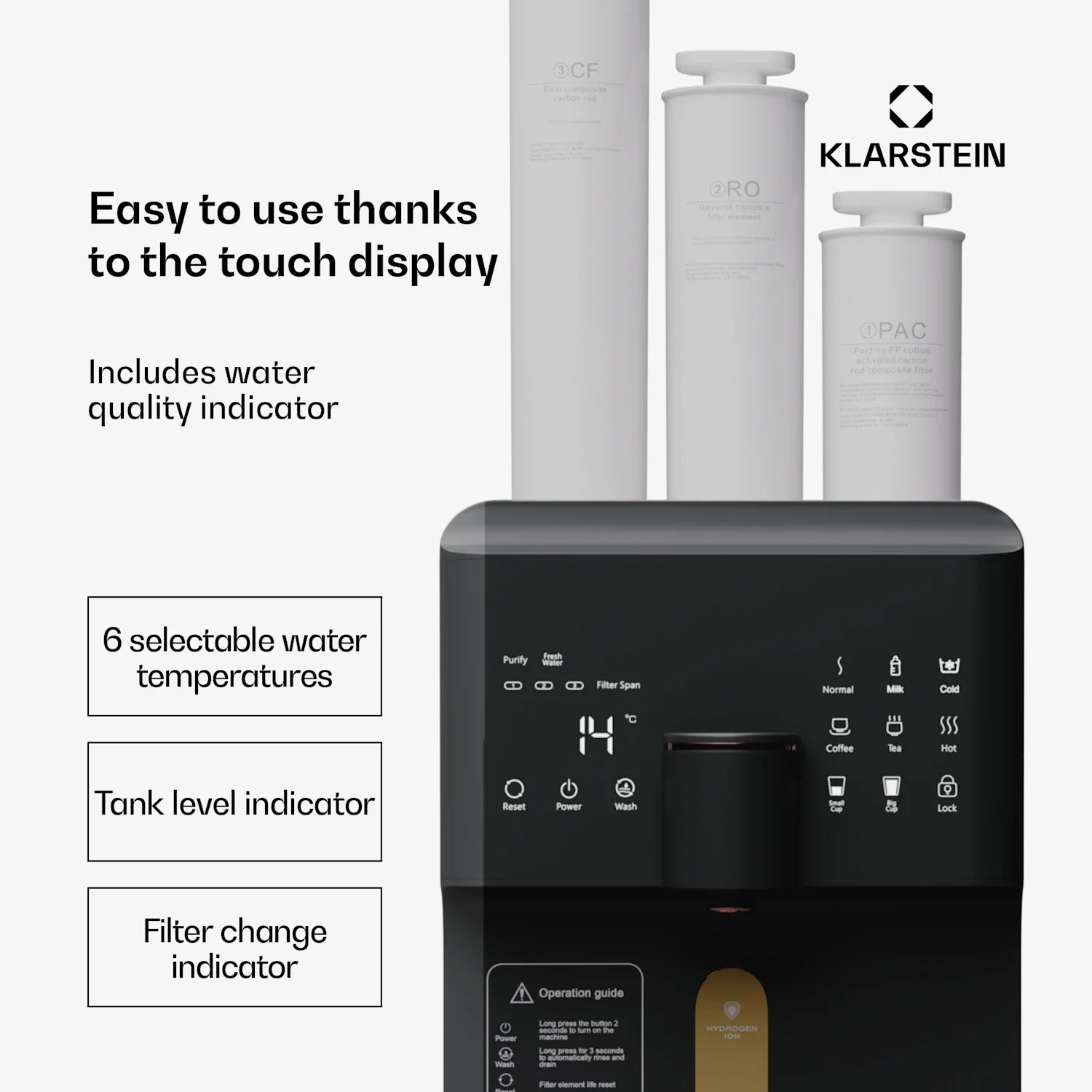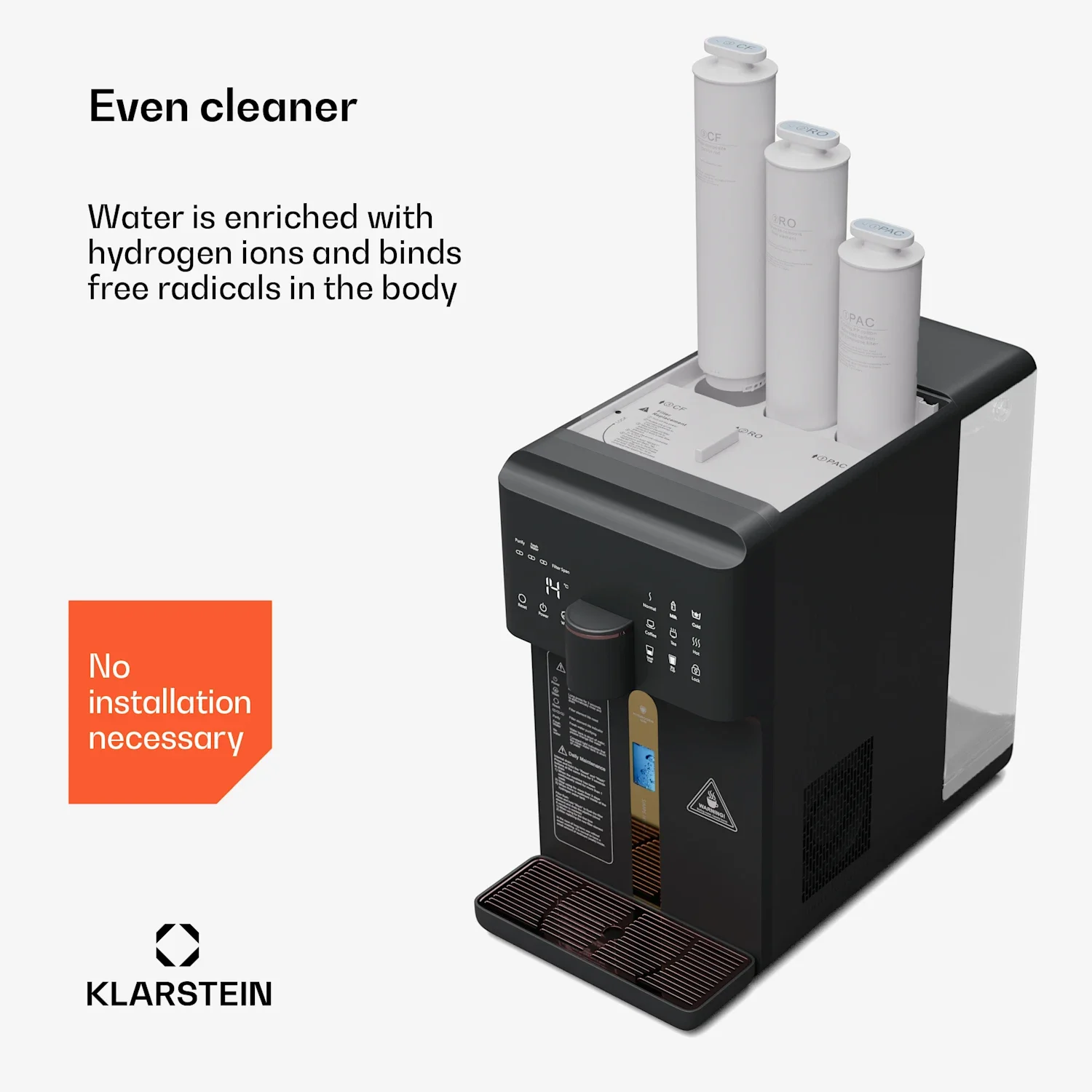 Technisch overtuigt de Klarstein AquaFina 6L waterzuiveraar met een tank van 6 liter, een modern tafelmodel design en eenvoudige installatie zonder wateraansluiting. Het HD touchscreen maakt het mogelijk om 6 verschillende watertemperaturen te kiezen en toont de waterkwaliteit.