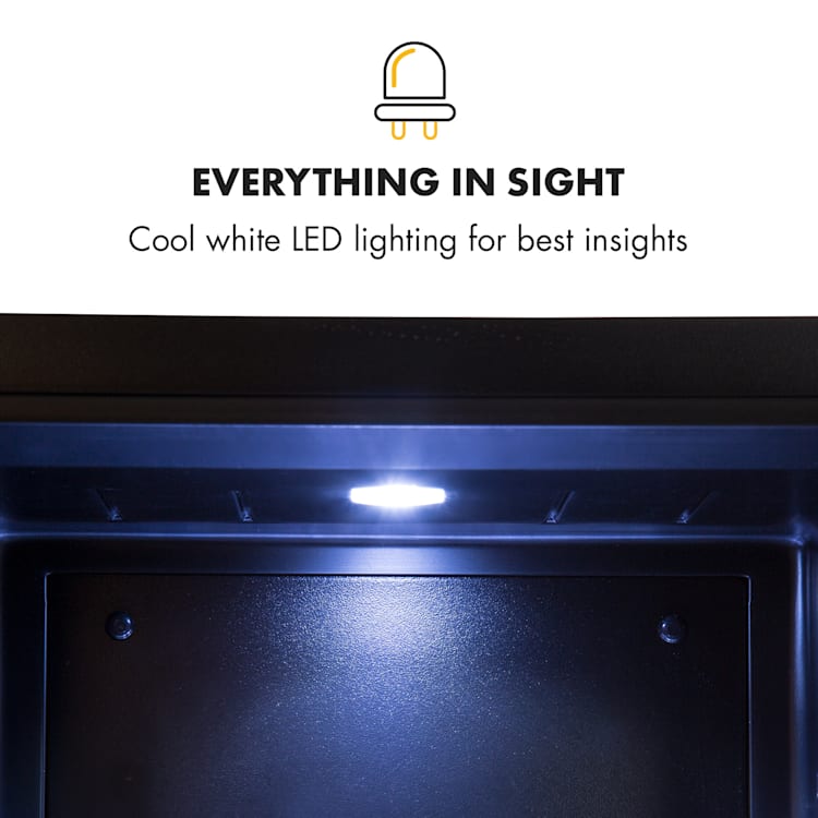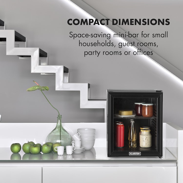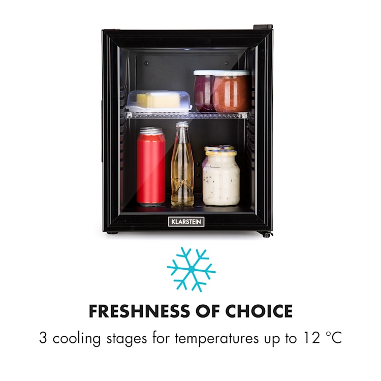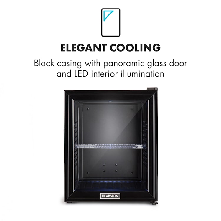 Compact en toch groot wat betreft opbergruimte: de Klarstein Brooklyn 32 mini-koelkast biedt met 32 liter bruikbare inhoud veel ruimte. Voor koeling naar wens zijn 3 niveaus beschikbaar om de koelcapaciteit te regelen van 12 tot 15 °C. De Brooklyn 32 maakt vooral indruk door zijn sensationele design: een panoramische glazen deur maakt continue een inkijkje in de binnenruimte mogelijk. Een led-licht aan de binnenkant verlicht bovendien prima de opgeslagen levensmiddelen bij het openen van de deur.Een aanwinst voor ieder klein huishouden: de Klarstein Brooklyn 32 mini-koelkast.